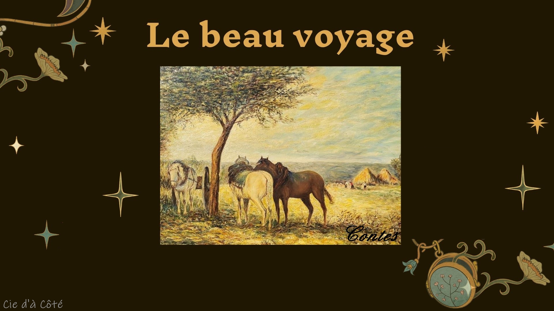 Le beau voyage (Conte) Deux amis. Un voyage à cheval. Des rencontres, des histoires et du vin. Le beau voyage est une invitation à la rêverie, au travers de contes variés, d’hier et d’aujourd’hui. Public : Adultes Avec Pascale Deloche